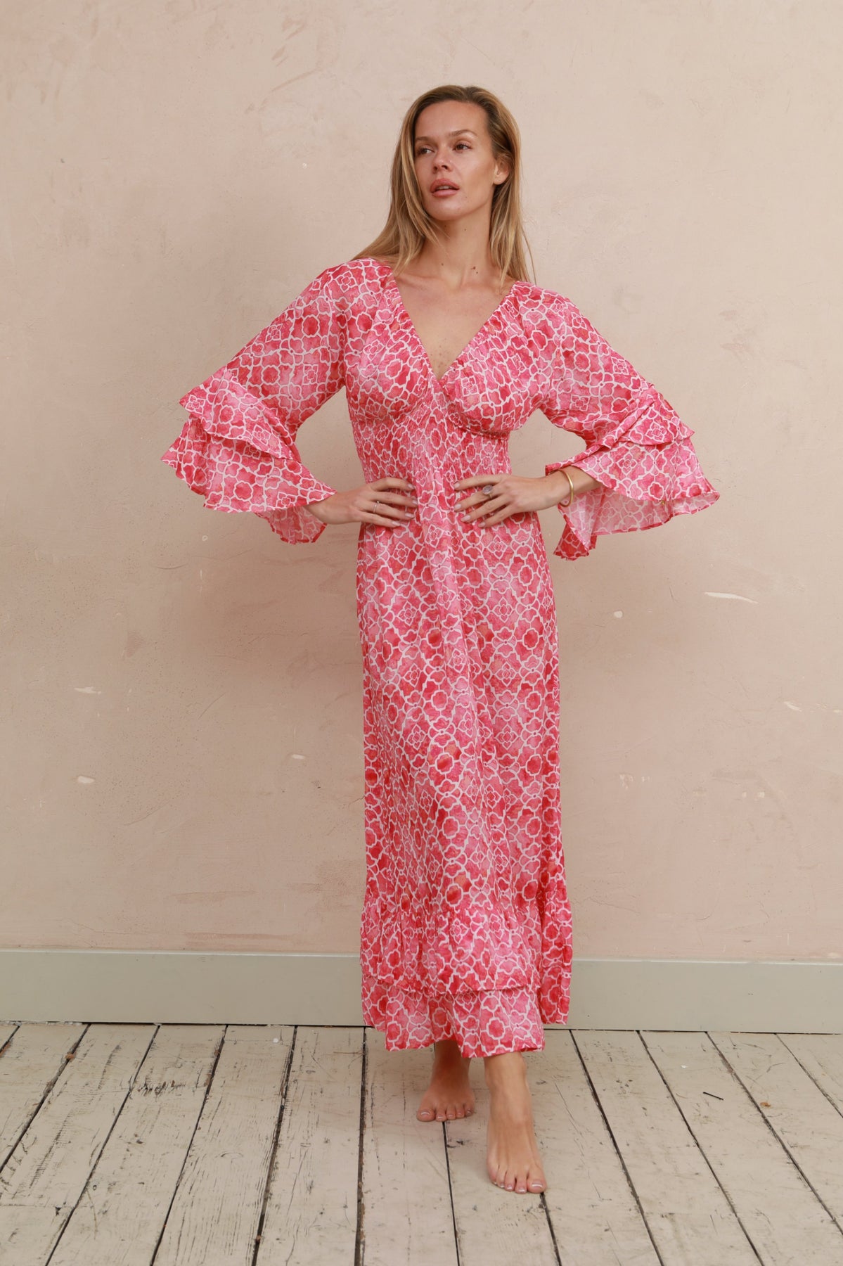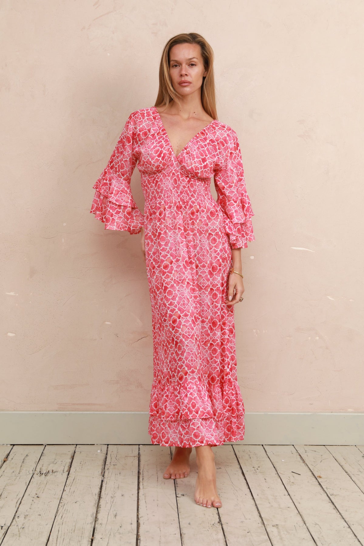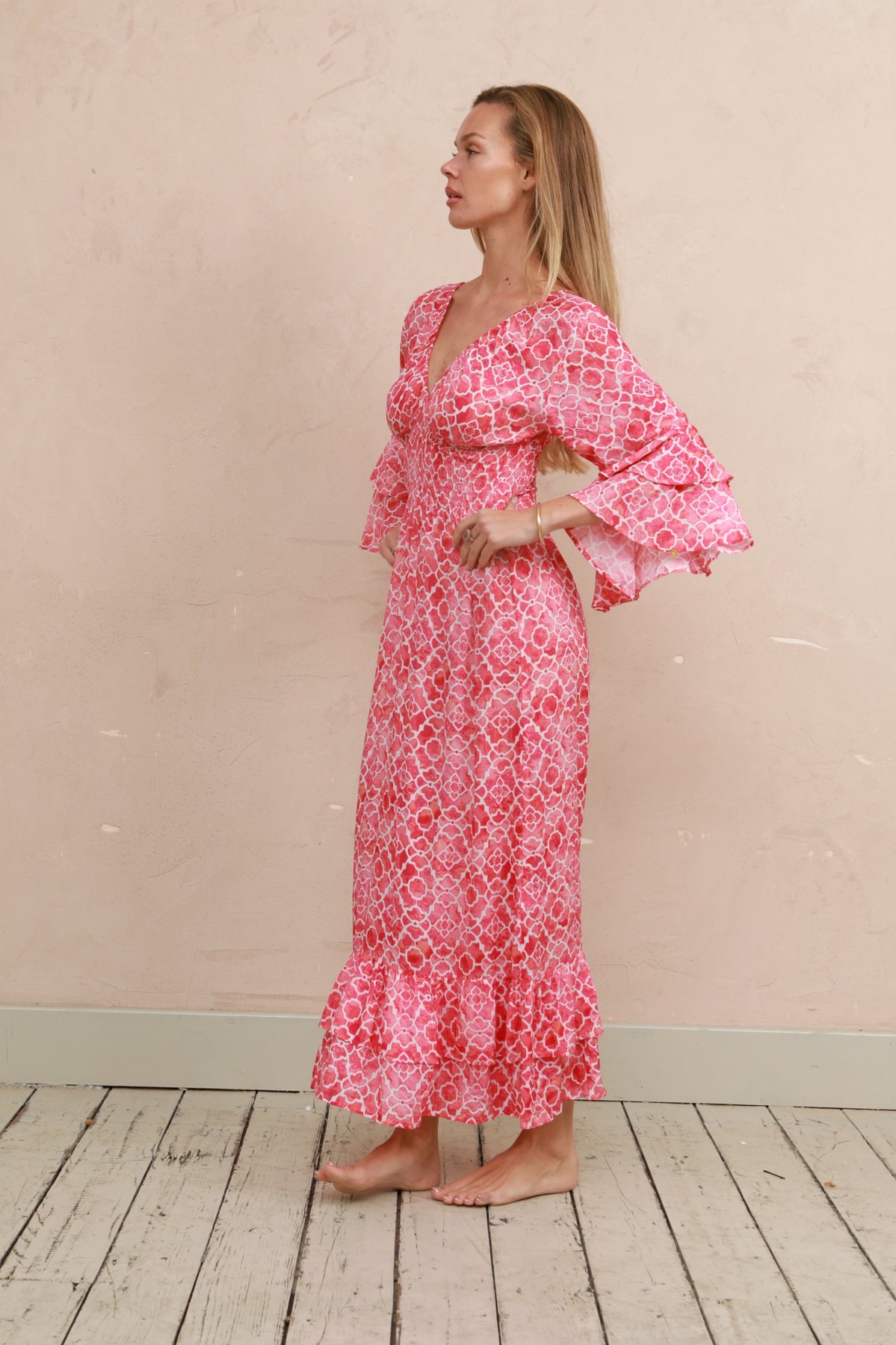 The shirred waist detailing creates a beautifully defined shape, ensuring comfort and elegance in equal measure, and flowing frill sleeves add an extra dose of feminine charm, creating an ethereal look.