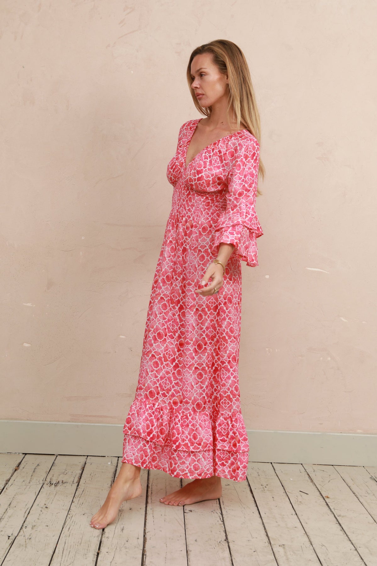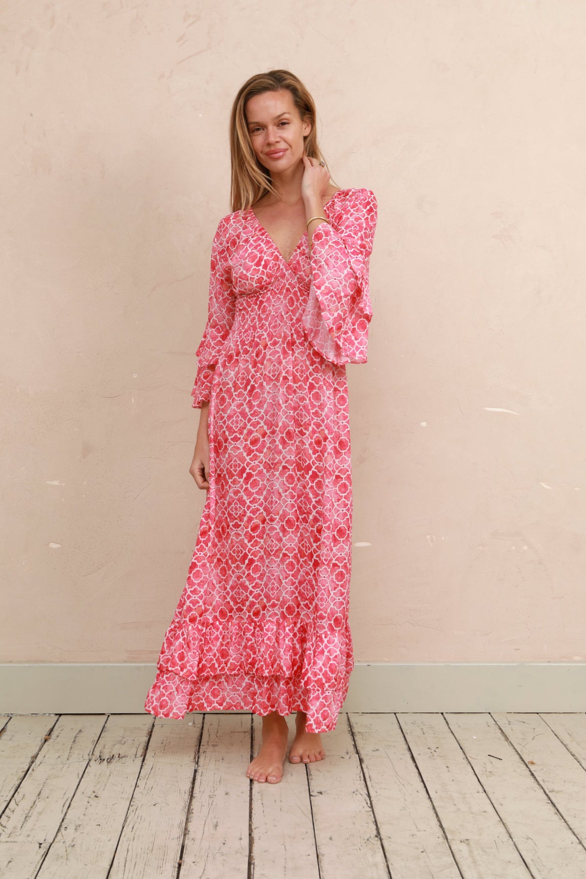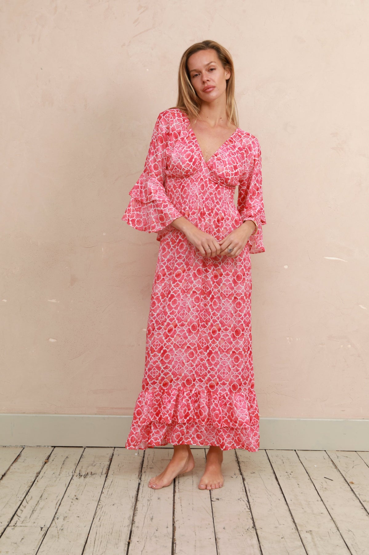 The shirred waist detailing creates a beautifully defined shape, ensuring comfort and elegance in equal measure, and flowing frill sleeves add an extra dose of feminine charm, creating an ethereal look.