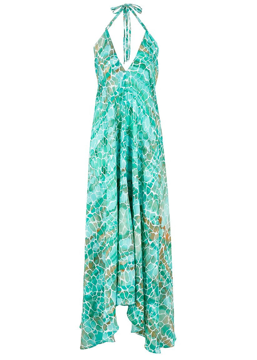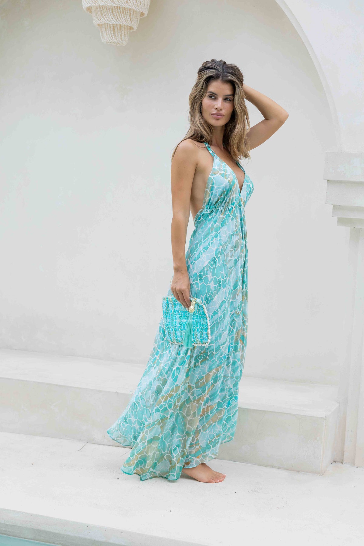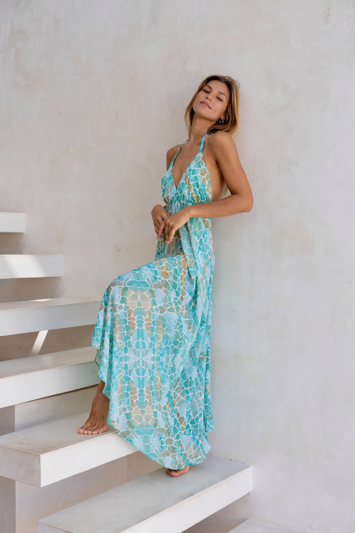 Effortlessly elegant and endlessly versatile, our luxurious silk Ibiza maxi dress is designed to move with you. It features an adjustable under-bust and halter neck tie for a custom fit, a flattering V-shaped open back, and a flowing hemline that drapes longer at the sides for graceful movement.