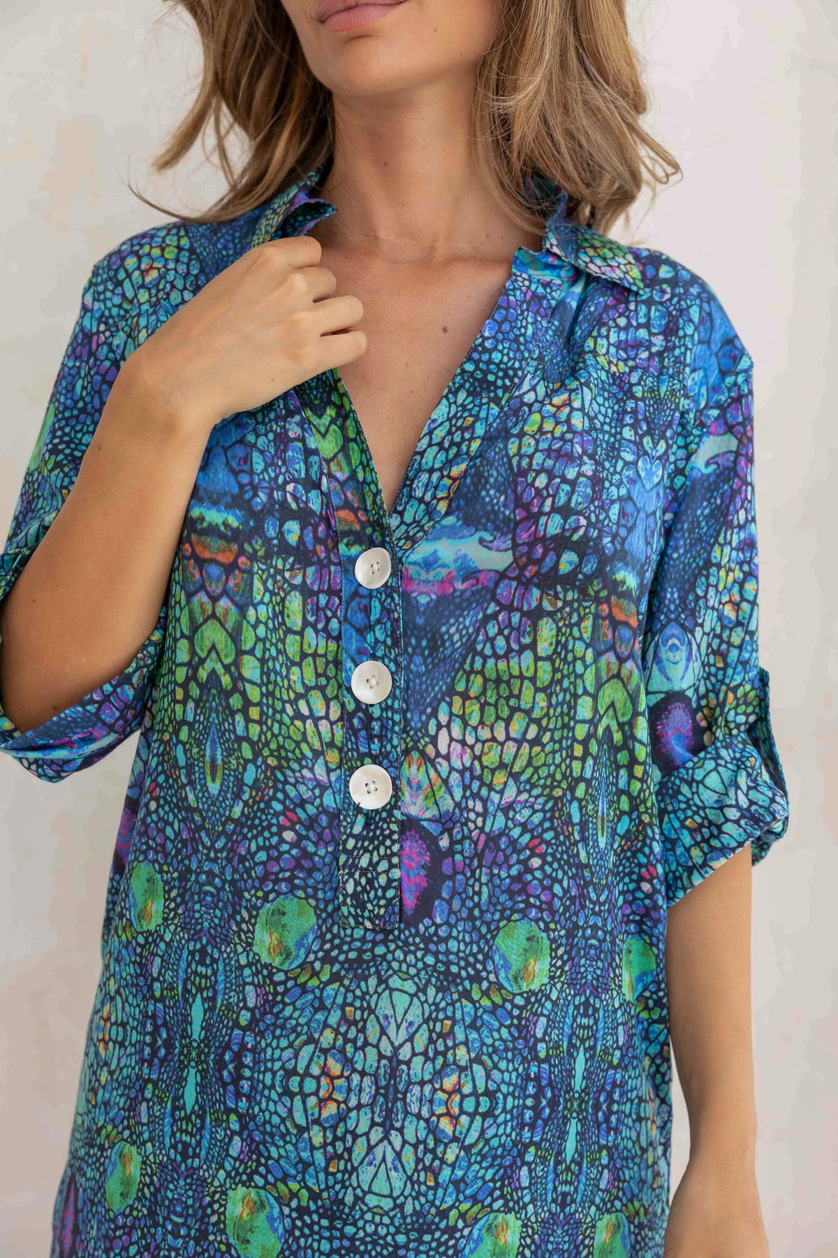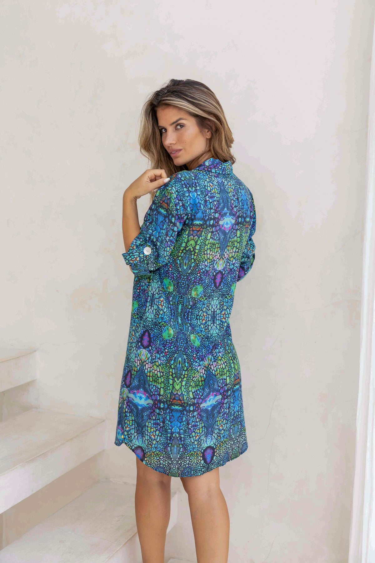 The Sophia Alexia beach shirt has a flattering collared v-neckline with a button-down design. It is loosely structured for a boho-chic feel, keeping you effortlessly cool in the sun. This above the knee style has adjustable sleeves with button fastening, a curved hem that falls slightly longer at the back and features large pearlescent shell buttons and gold stitching.