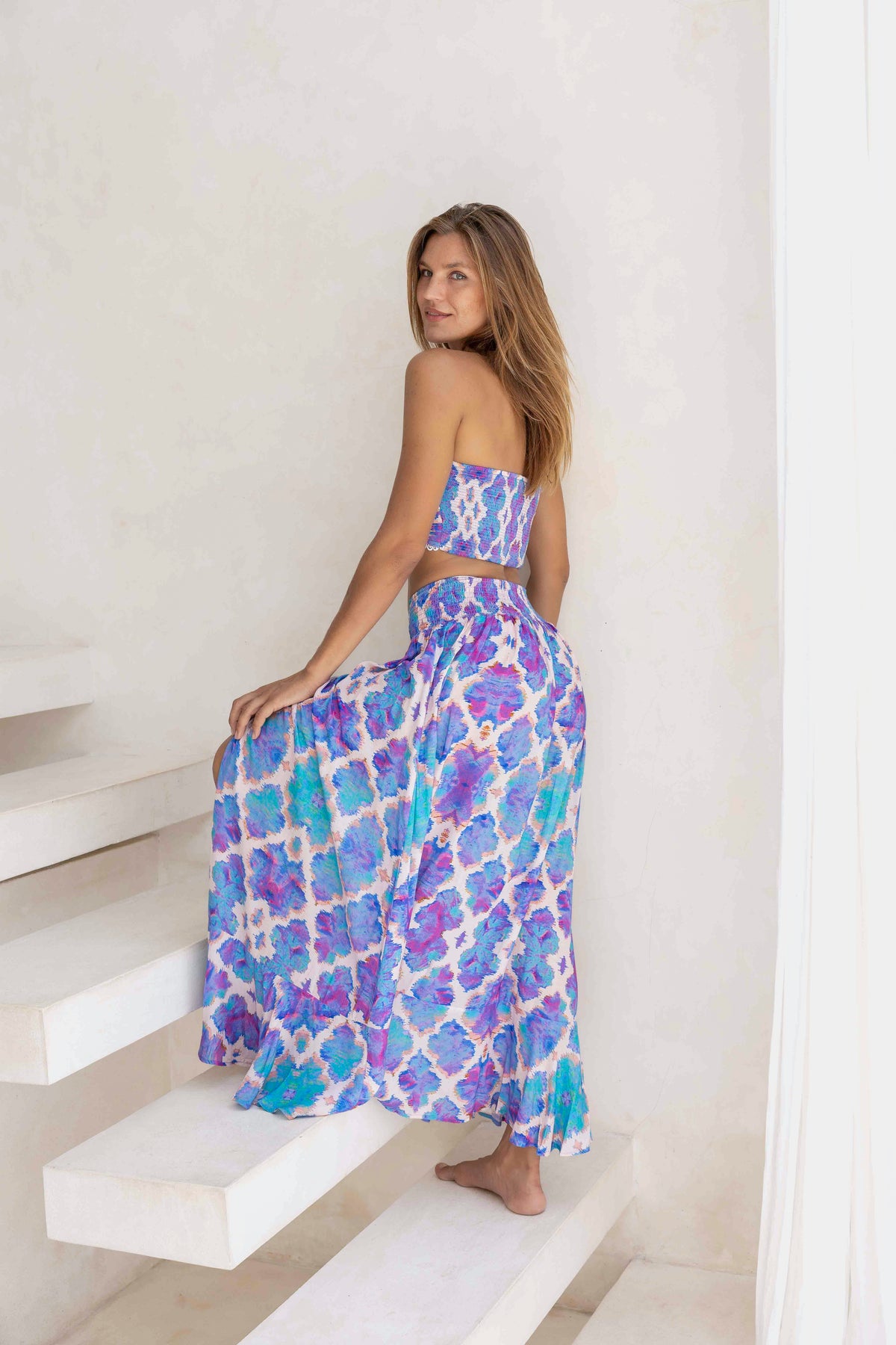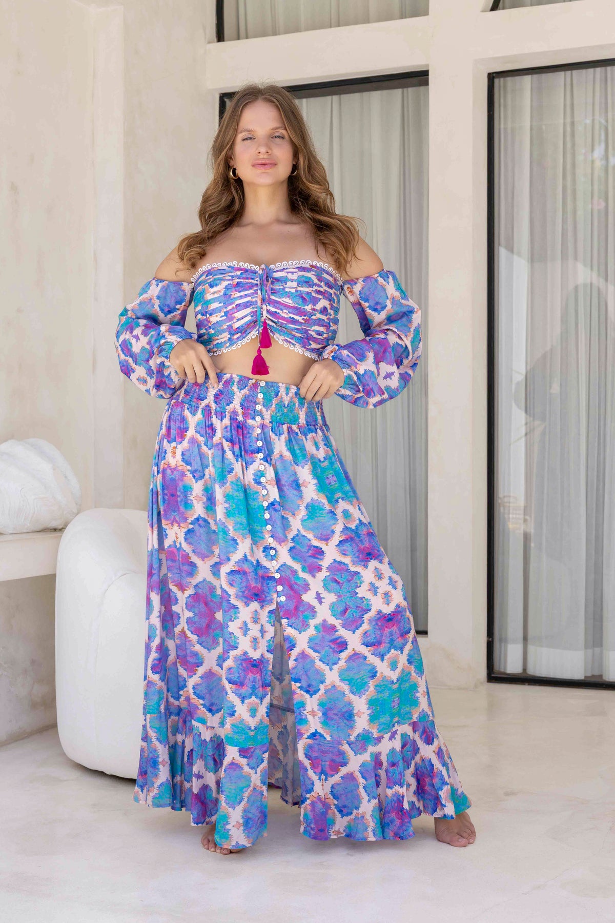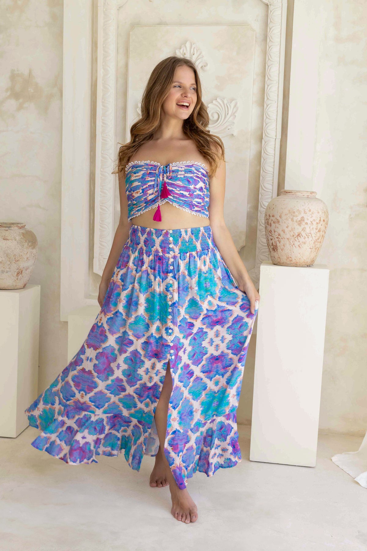 Our Fiji skirt has an elasticated smocked high waist for a comfortable and flattering fit with a button-down front slit. Coordinate the skirt with the matching Fiji Top for the perfect boho inspired outfit or style it with our swimwear to complete the look.