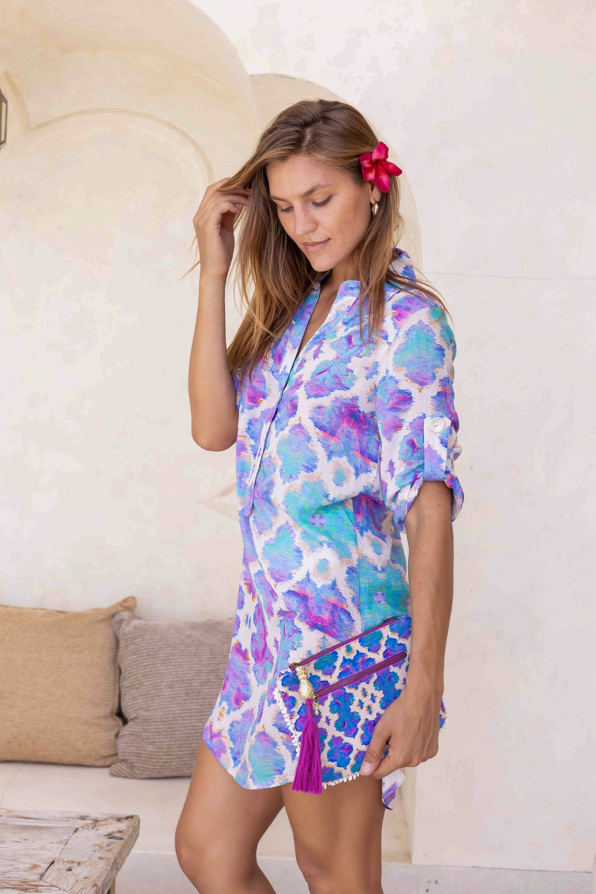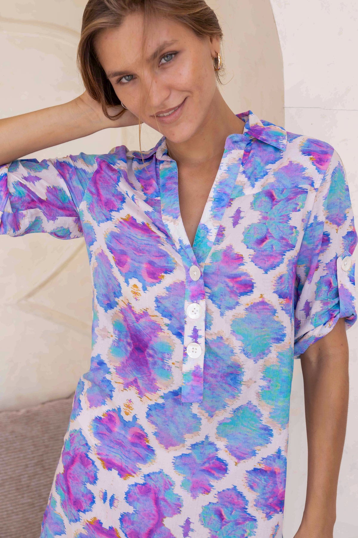 The Sophia Alexia beach shirt has a flattering collared v-neckline with a button-down design. It is loosely structured for a boho-chic feel, keeping you effortlessly cool in the sun. This above the knee style has adjustable sleeves with button fastening, a curved hem that falls slightly longer at the back and features large pearlescent shell buttons and gold stitching.